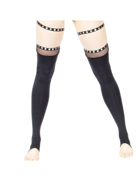 Čierne návleky na nohy Kali s funky fóliovými cvočkami a jemnou sieťkou na vrchnej časti stehien. Vystrihnutá špička a päta pre lepšiu priľnavosť.