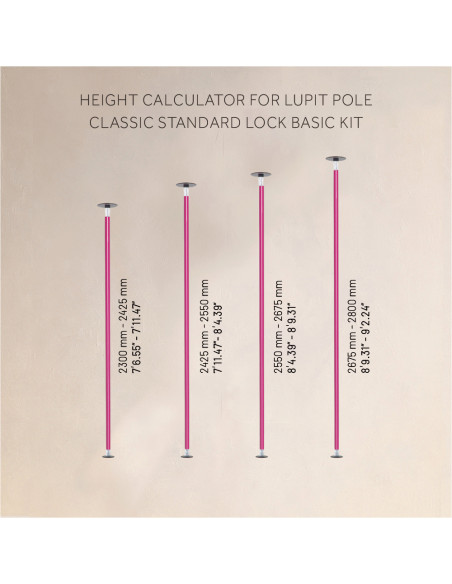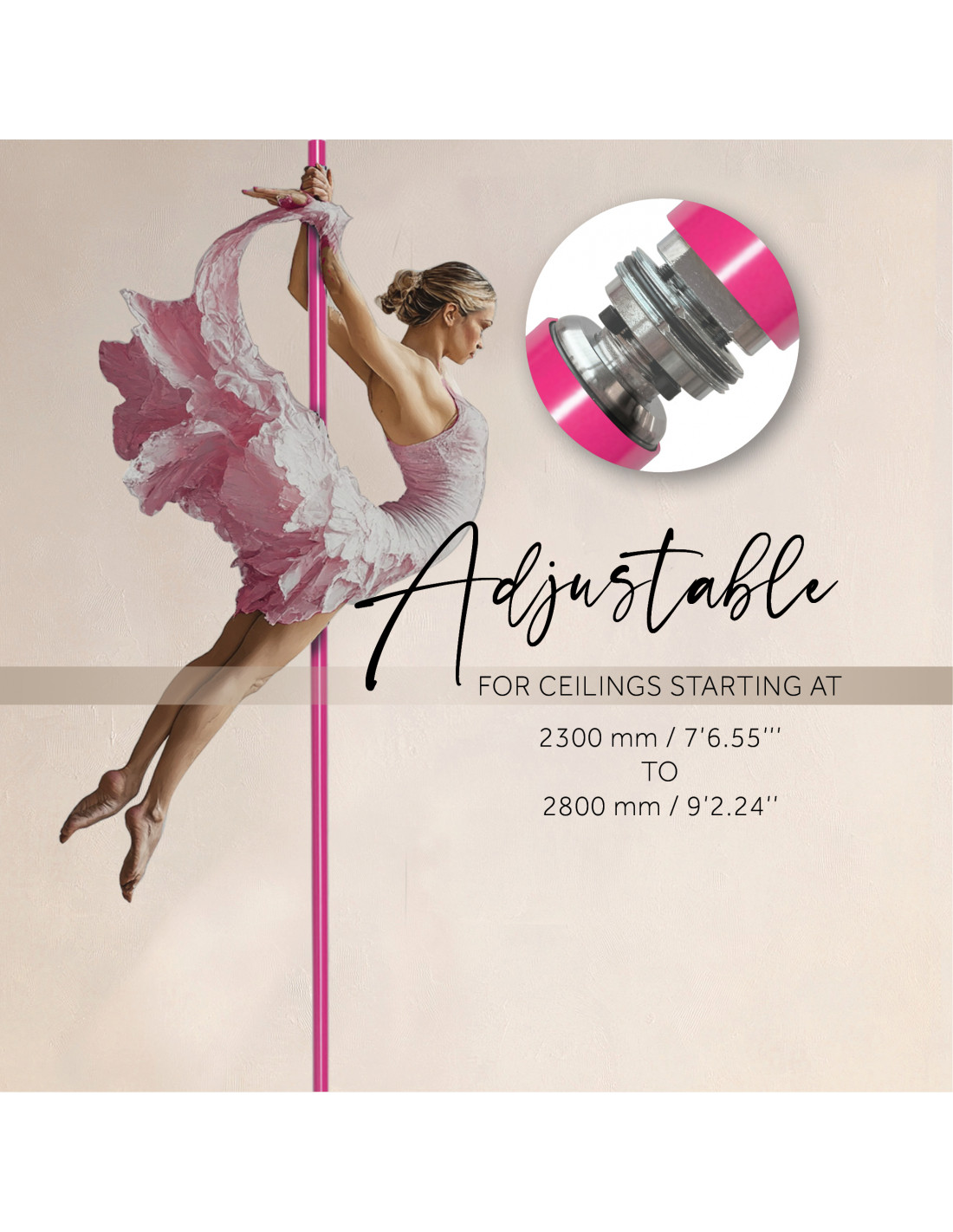 Pole dance tyč v základnom balení je vhodná do priestoru s max. výškou stropu do 2800 mm. V prípade vyššieho stropu nad 2800 mm je potrebné dokúpiť predĺženie. S predĺžením môžete tyč použiť až do výšky 3300 mm. Predĺženie nie je súčasťou základného balenia.