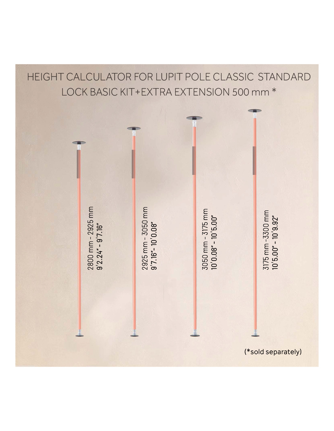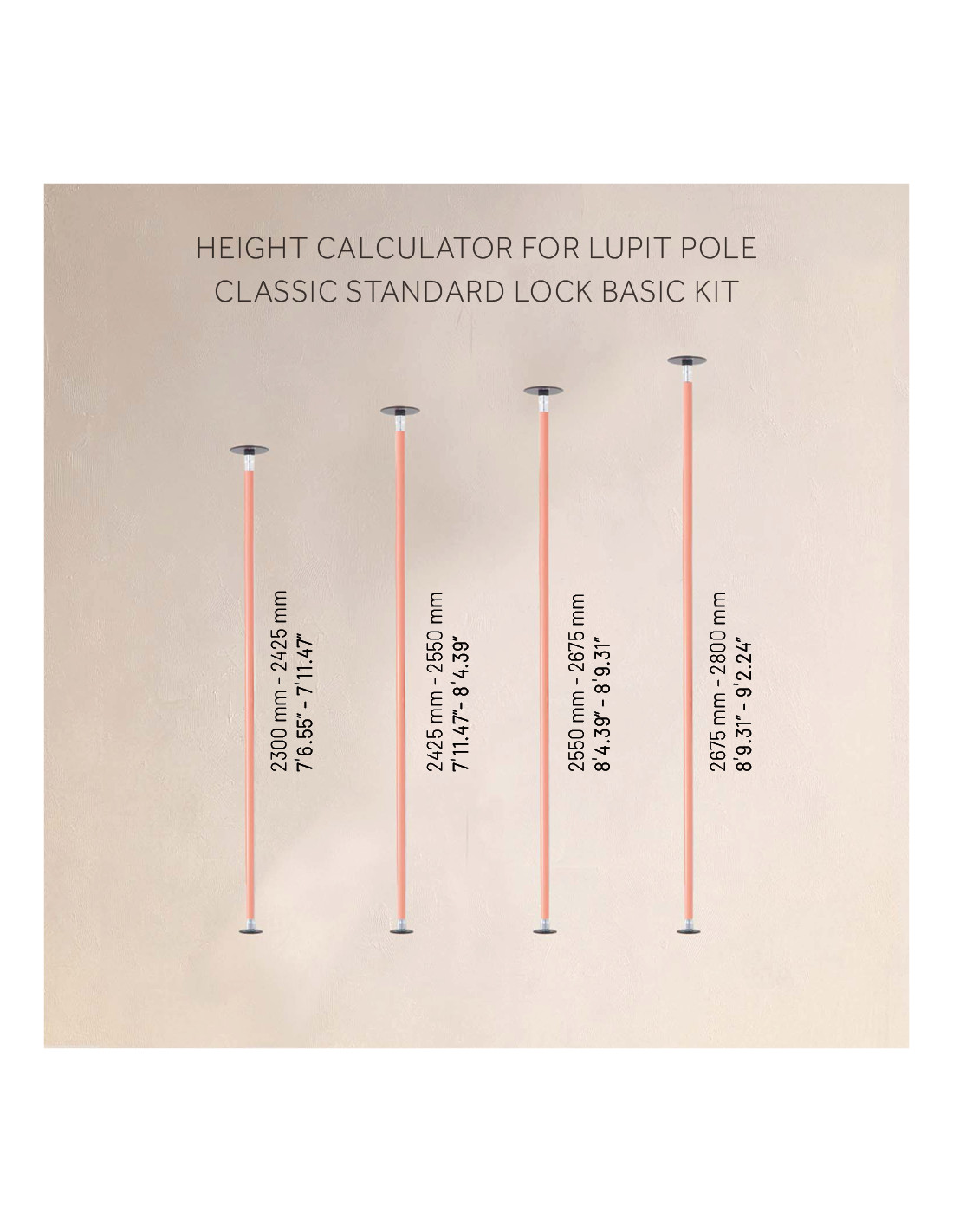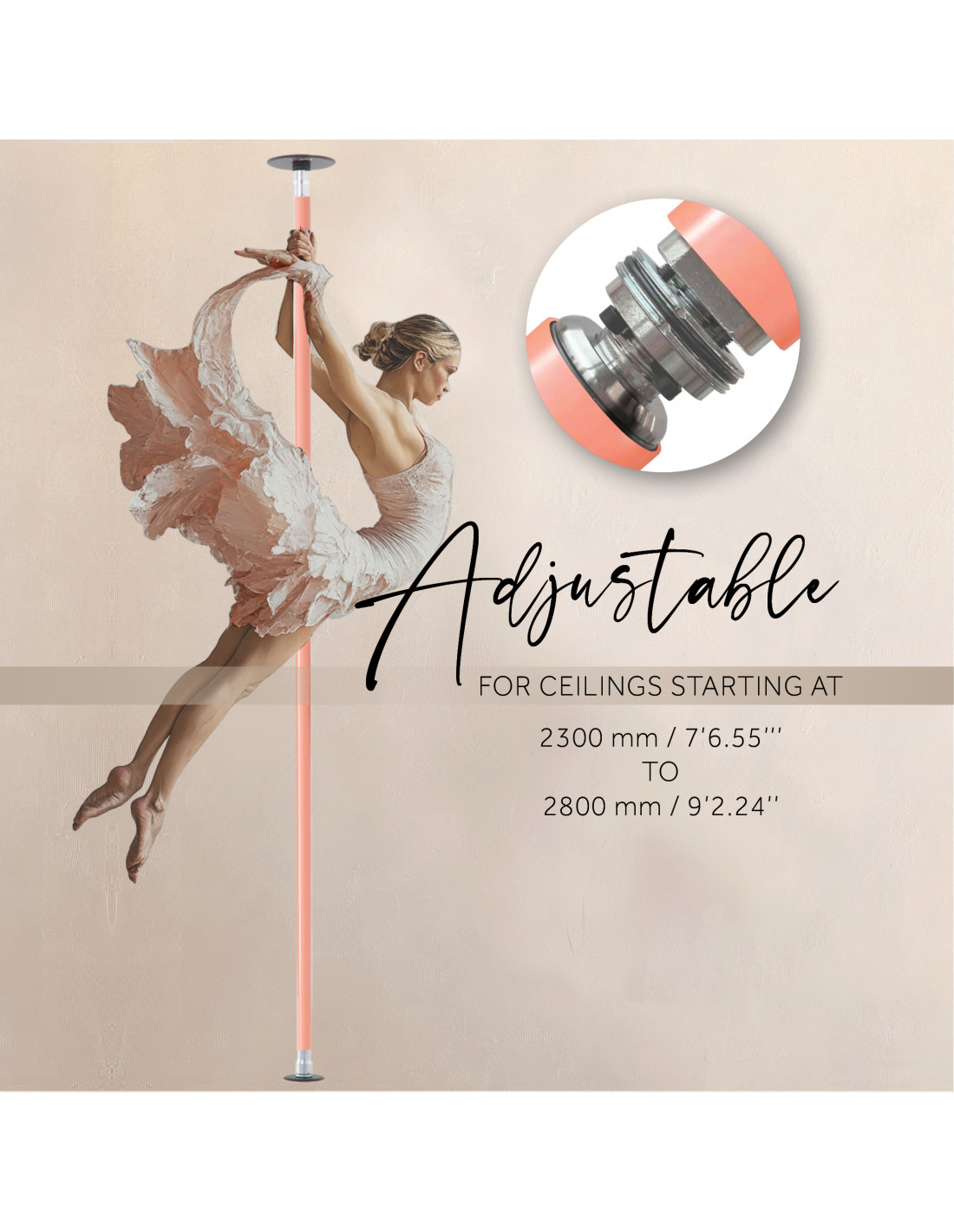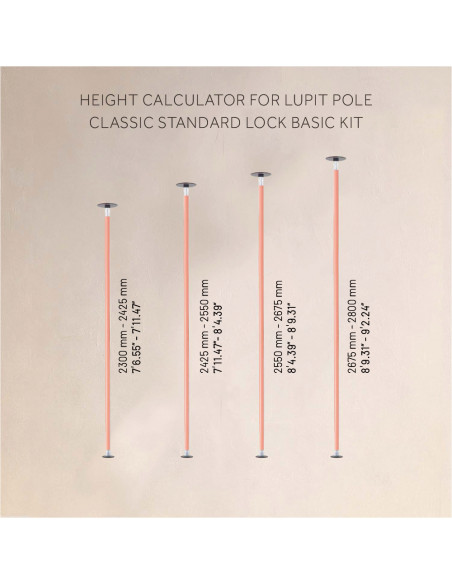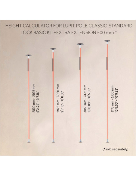 Pole dance tyč v základnom balení je vhodná do priestoru s max. výškou stropu do 2800 mm. V prípade vyššieho stropu nad 2800 mm je potrebné dokúpiť predĺženie. S predĺžením môžete tyč použiť až do výšky 3300 mm. Predĺženie nie je súčasťou základného balenia.