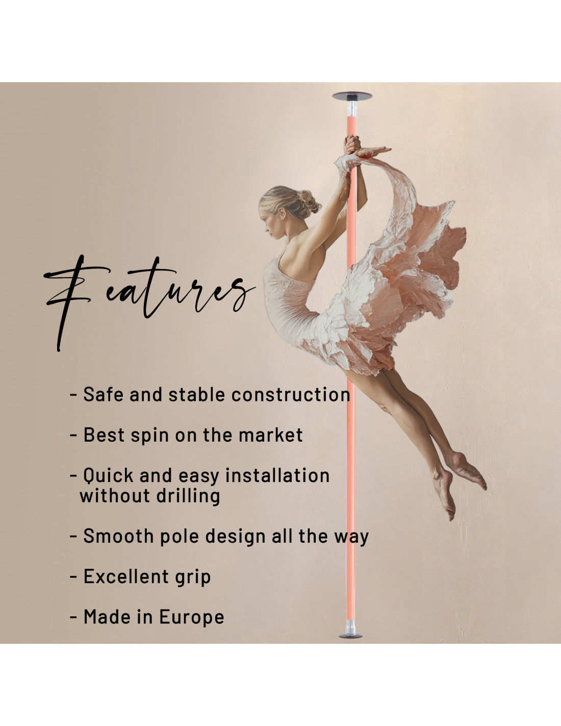Statická aj spinová rozkladacia tanečná tyč v jednom. Ideálna voľba ak plánujete veľa cvičiť v domácom prostredí. Má vynikajúcu priľnavosť a veľmi hladkú textúru. Jednoduchá inštalácia do pár minút.